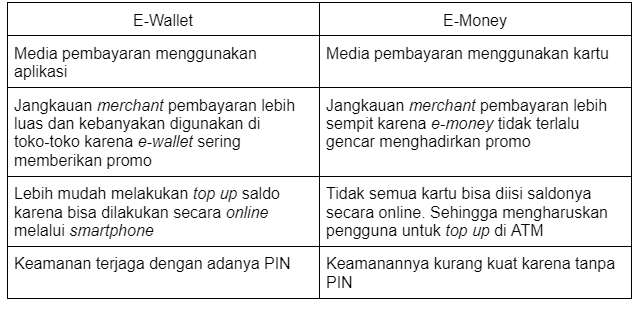 Meskipun fungsinya kurang-lebih sama, e-wallet dan e-money adalah dua hal yang berbeda. Berikut perbedaannya: