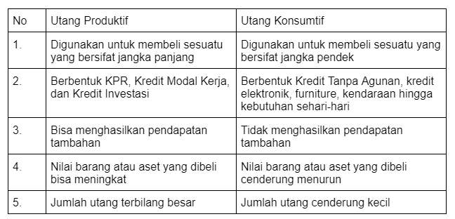Padahal, berutang tak selamanya buruk. Bahkan, berutang bisa jadi penyelamat dalam keadaan terdesak. Jika digunakan untuk memenuhi kebutuhan jangka pendek, utang tersebut dikategorikan sebagai utang konsumtif. Selain itu, ada pula utang produktif, yaitu utang yang bisa mendatangkan pendapatan tambahan.